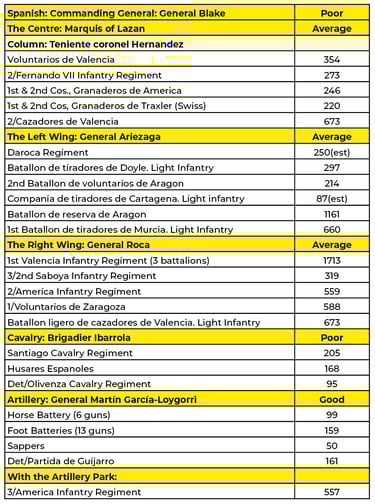 I have compiled OBs (see below) from both Heythornthwaite and Oman. It is obvious that nearly all battalions on both sides are small to regular. In my view, the quality and condition of the troops are important in this scenario. That said, most of the infantry I would classify as Conscript to Regular. The only veterans would be Suchet’s escort of the 64th and 40th Hussars, the 4th Hussars, and perhaps the 13th Cuirassiers. The artillery on both sides is regular. You could classify the two small Spanish grenadier battalions as veterans if you are feeling generous.