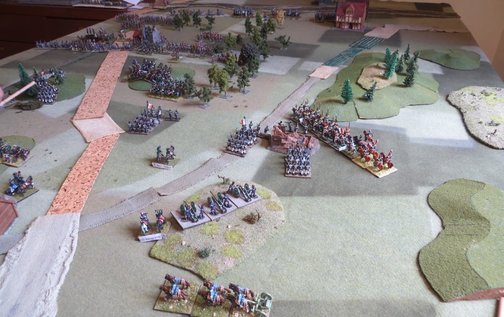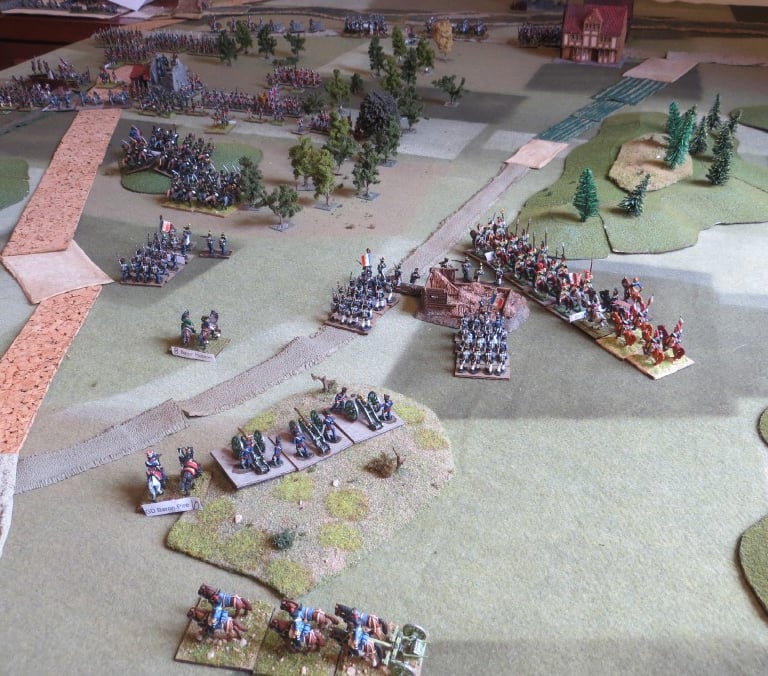 8pm. British right flank: The French mount a massive and desperate attack after a stern firefight in which the 1/108 has had to withhold casualties. The British Hanoverian battery has taken the opportunity to return to it’s position.