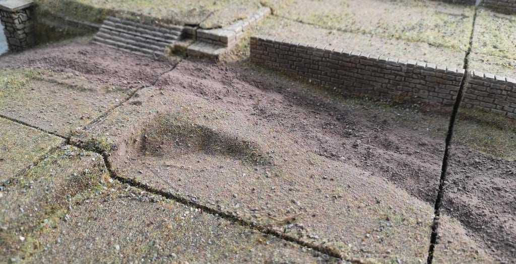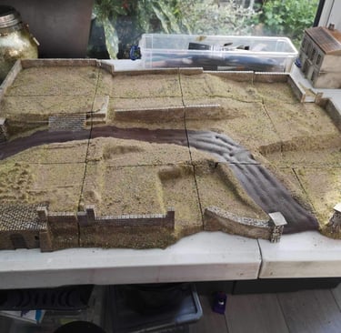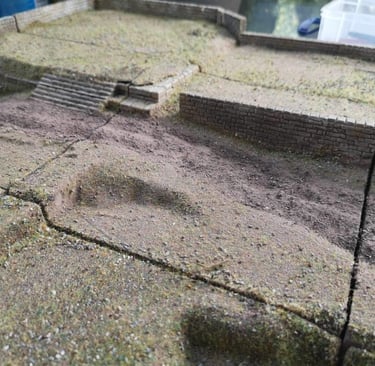 Photo 5. Cover road surface with dirt mix (I get soil from my garden, bake it in oven until completely dry of any moisture, put it in carrier bag and then give it a good hammering with a rolling pin). Sprinkle onto a PVA prepared road surface. Seal whole surface with PVA/water in spray bottle. Add veg and buildings to suit