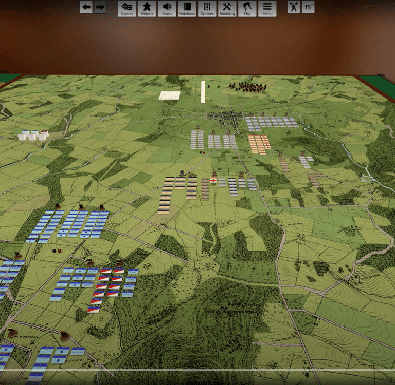 Reisswitz' demonstration in 1812 at the Prussian palace showcased a hand-sculpted model with intricate details. Although impressive, the custom-built nature limited broader distribution. Reisswitz' son, George Henrik Rudolf Johann von Reisswitz, took up the mantle in 1824, releasing a new edition. Notable changes included increased map resolution, a return to flat maps leveraging topographic cartography, and the introduction of umpires and dice.